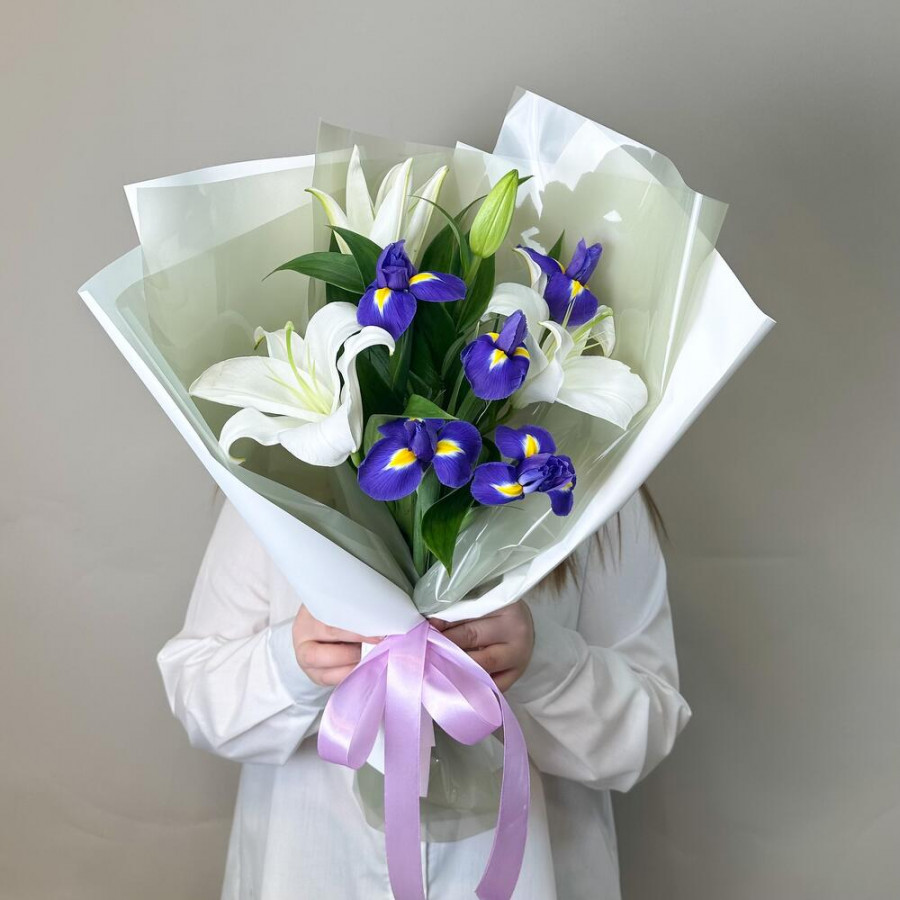 На фото букет «магия лилий». В составе: лилия 1 шт, ирис 5 шт, дизайнерская упаковка 1 шт, атласная лента 1 шт, . Все цветы свежие и ароматные, букет красиво оформлен и отлично подходит для подарка. Доступна доставка цветов или самовывоз.